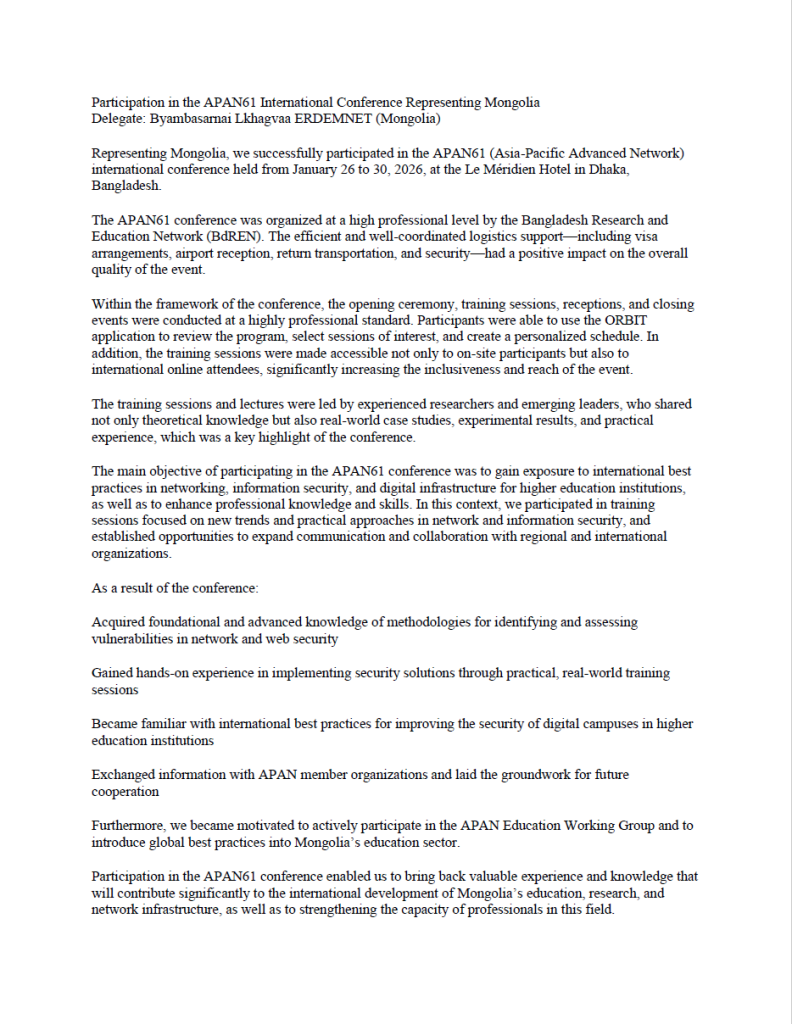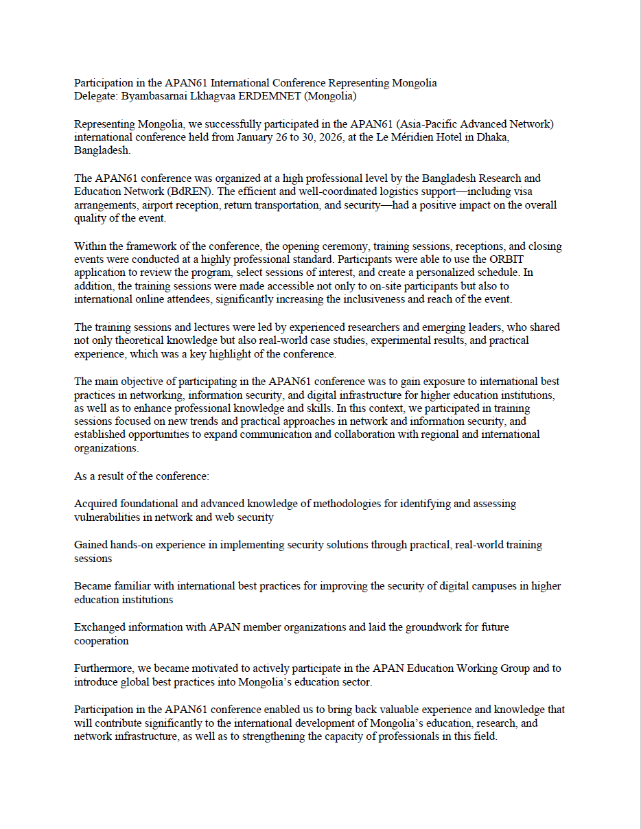 Representing Mongolia, we successfully participated in the APAN61 (Asia-Pacific Advanced Network) international conference held from January 26 to 30, 2026, at the Le Méridien Hotel in Dhaka, Bangladesh.